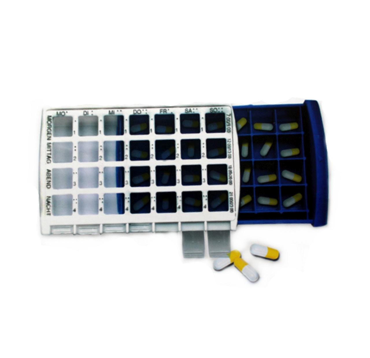 Tabletten-/Pillenbox für 7 Tage. Jeder Tag ist in 4 weitere Fächer unterteilt („Morgen“, Mittag“, „Abend“ und „Nacht“).