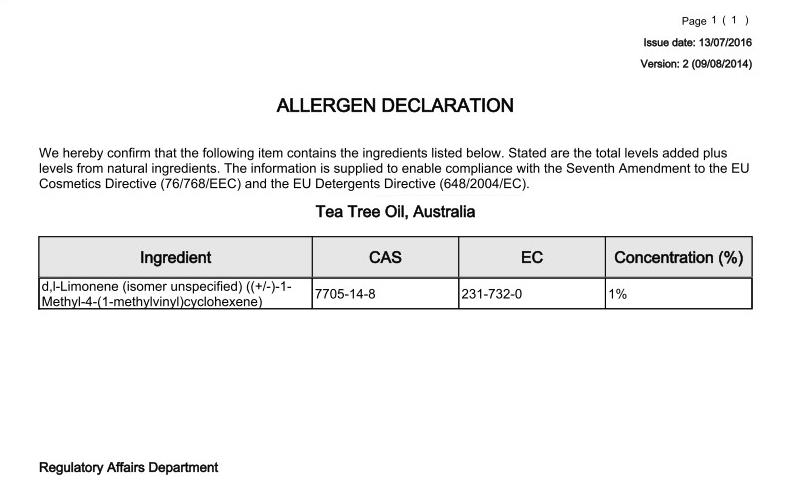 Unser ätherisches Teebaumöl ist 100% naturrein und enthält keinerlei Zusatzstoffe. Die Verarbeitung des Rohstoffs (Herkunftsland Australien) erfolgt in der EU auf Basis höchster Qualitätsstandards (beachten Sie zur Information auch die Analysedaten neben der Produktabbildung).