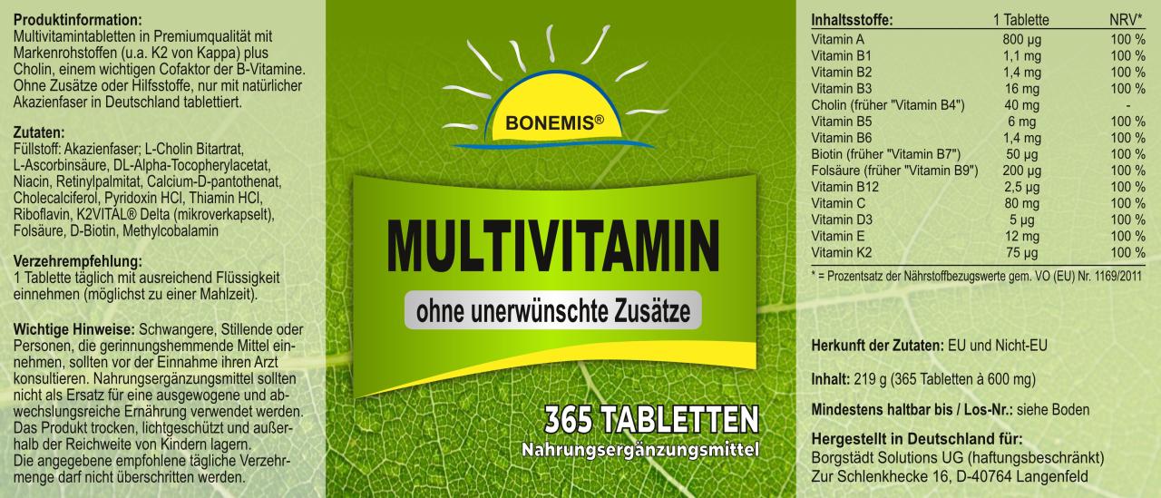 Jede Tablette enthält 100% der empfohlenen Tagesdosis (nach NRV*) der Vitamine A, B (B-Komplex), C, D3, E und K2. Daneben auch den wichtigen Cofaktor der B-Vitamine (Cholin, früher als "Vitamin B4" bezeichnet).