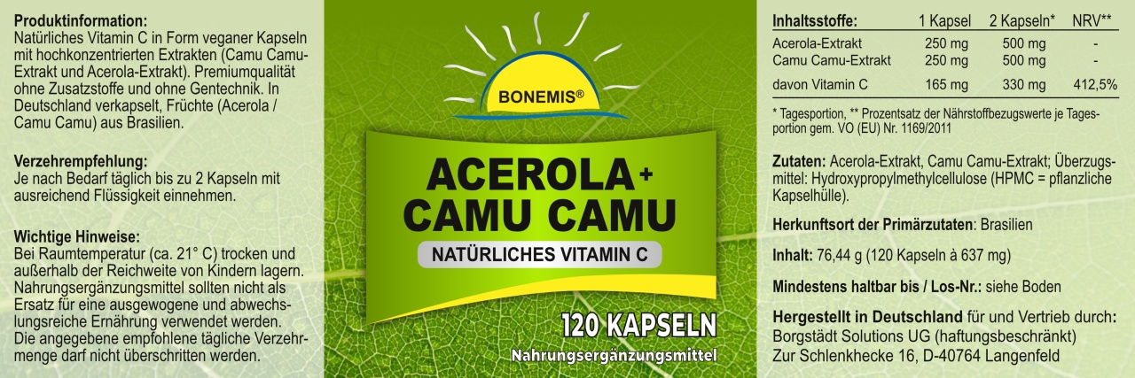 Natürliches Vitamin C in Form veganer Kapseln mit hochkonzentriertem Acerola-Extrakt (aus dem Fruchtfleisch der Acerola-Kirsche) und Camu Camu-Extrakt (50:1 konzentriert). Premiumqualität ohne Zusatzstoffe und ohne Gentechnik. Hergestellt in Deutschland (Rohstoffherkunft Brasilien). 120 Kapseln à 500 mg. Abgefüllt im hochwertigen Braunglasbehälter.