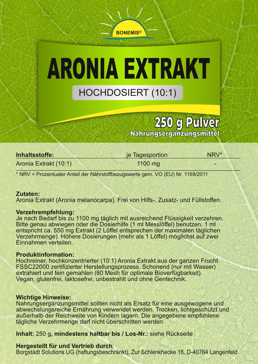 Bonemis® Aronia Extrakt, hochkonzentriert (10:1), ohne Zusatzstoffe, 250 g Pulver im Beutel