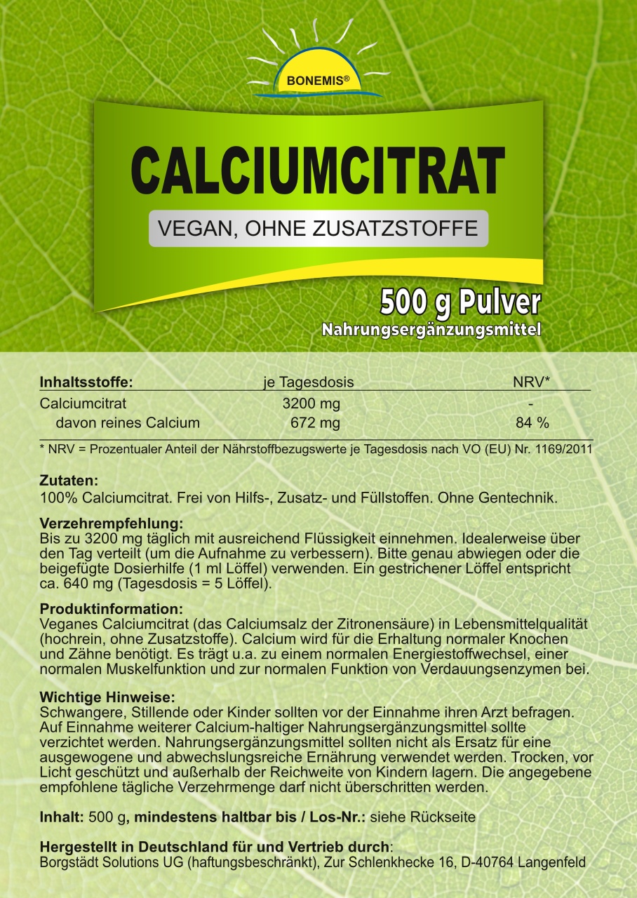 Veganes Calciumcitrat (das Calciumsalz der Zitronensäure) in Lebensmittelqualität (hochrein, ohne Zusatzstoffe). 500 g im Standbodenbeutel aus Kraftpapier (aluminiumfrei!) mit wiederverschließbarem Druckverschluss. Dosierhilfe liegt bei. Hergestellt und abgefüllt in Deutschland.