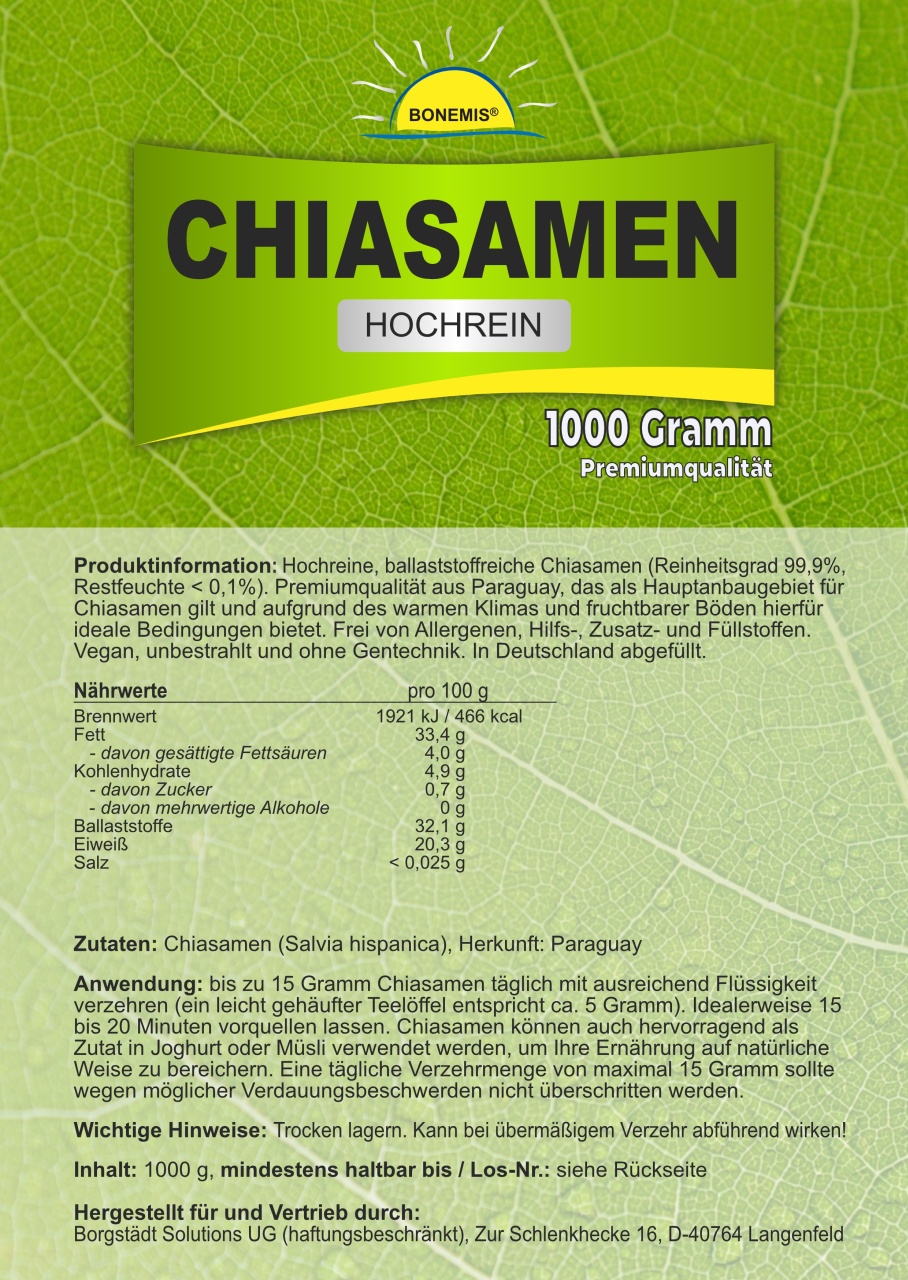 Bonemis® Chiasamen, hochrein (mind. 99,9%), Premiumqualität aus Paraguay, ohne Zusätze, 1 kg Beutel