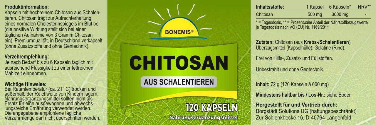 Chitosan trägt zur Aufrechterhaltung eines normalen Cholesterinspiegels im Blut bei (die positive Wirkung stellt sich bei einer täglichen Aufnahme von 3 Gramm Chitosan ein).