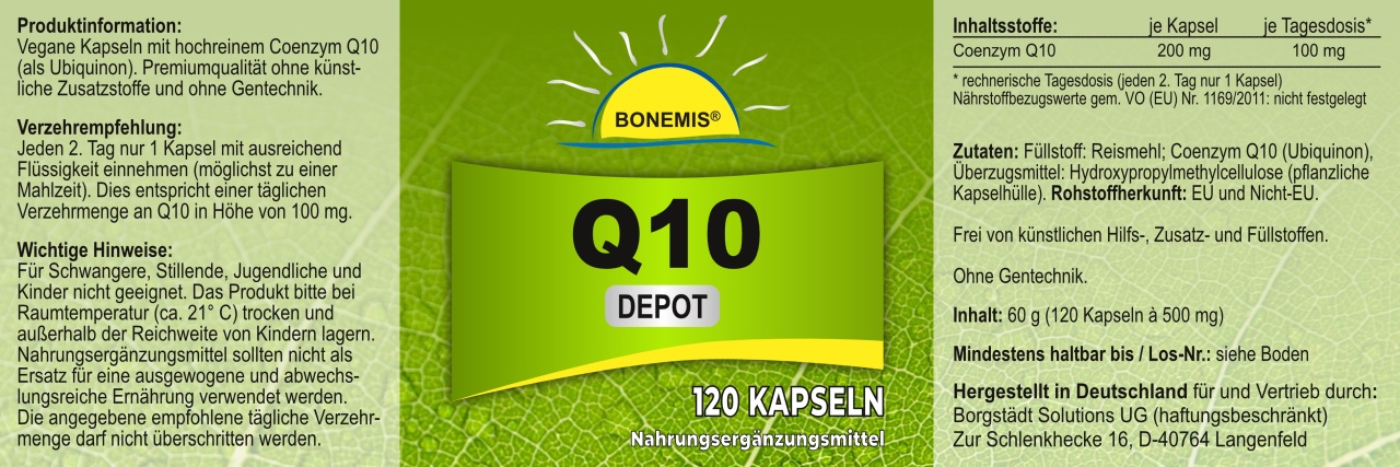 Vegane Kapseln mit hochreinem (>99%) Coenzym Q10 als Ubiquinon (auch als Ubichinon bezeichnet). Hochdosierte 200 mg Q10 je Kapsel. Verzehrempfehlung: jeden 2. Tag nur 1 Kapsel, was einer täglichen Verzehrmenge an Q10 in Höhe von 100 mg und damit der für Nahrungsergänzungsmittel erlaubten Maximaldosierung entspricht (gemäß Allgemeinverfügung BVL 14/01/002 des Bundesamts für Verbraucherschutz und Lebensmittelsicherheit). 120 Kapseln, abgefüllt im hochwertigen Braunglasbehälter mit Frischeversiegelung und zusätzlichem Siegeletikett für Ihre Sicherheit. Wir kontrollieren selbstverständlich jedes Produkt vor Auslieferung. Sie können aber so auf Anhieb selber erkennen, ob sich die Ware auch nach dem Transport im unversehrten Originalzustand befindet.