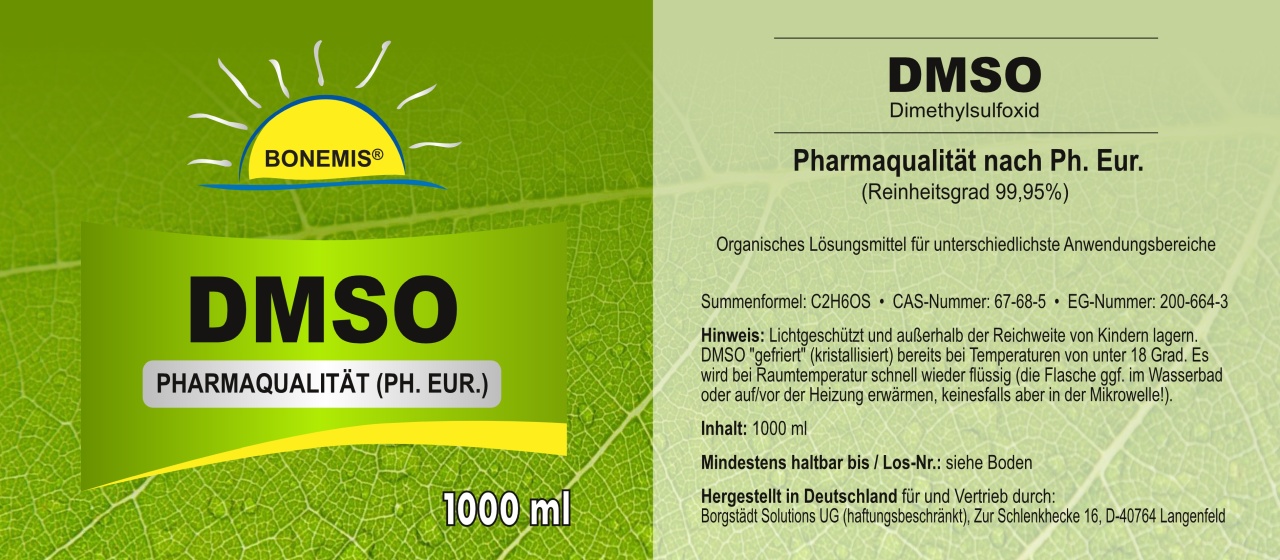 Tipp zu Produktqualitäten: DMSO ist eine transparente Flüssigkeit, die aus Holz gewonnen wird. Am verbreitetsten sind dabei günstige, oftmals im Ausland oder unter schlechten Bedingungen hergestellte technische Qualitäten. Diese weisen zwar oft einen hohen Reinheitsgrad von über 99% auf, die restlichen 1% bestehen aber nicht selten aus schädlichen Substanzen. Auf diesen Umstand wird leider nicht oft genug hingewiesen. Derlei DMSO-Qualitäten sollten ausschließlich für den ursprünglichen Einsatzzweck, also als Lösungsmittel, verwendet werden. Zu erkennen sind technische Qualitäten oftmals schon am unangenehmen, teilweise "beißendem" Geruch (dies kann aber nur als Anhaltspunkt dienen, da der Geruch von manchen Menschen nicht wahrgenommen wird). Eine hochwertige DMSO-Qualität, so wie das hier angebotene DMSO von Bonemis, ist nach der Erstöffnung praktisch geruchlos (manche Menschen nehmen einen charakteristischen, leicht zwiebelartigen Geruch war). Um die Anforderungen nach Pharmaqualität (Ph. Eur.) zu erfüllen, ist ein Reinheitsgrad von 99,80% erforderlich. Unser Produkt übertrifft diese mit 99,95% deutlich.