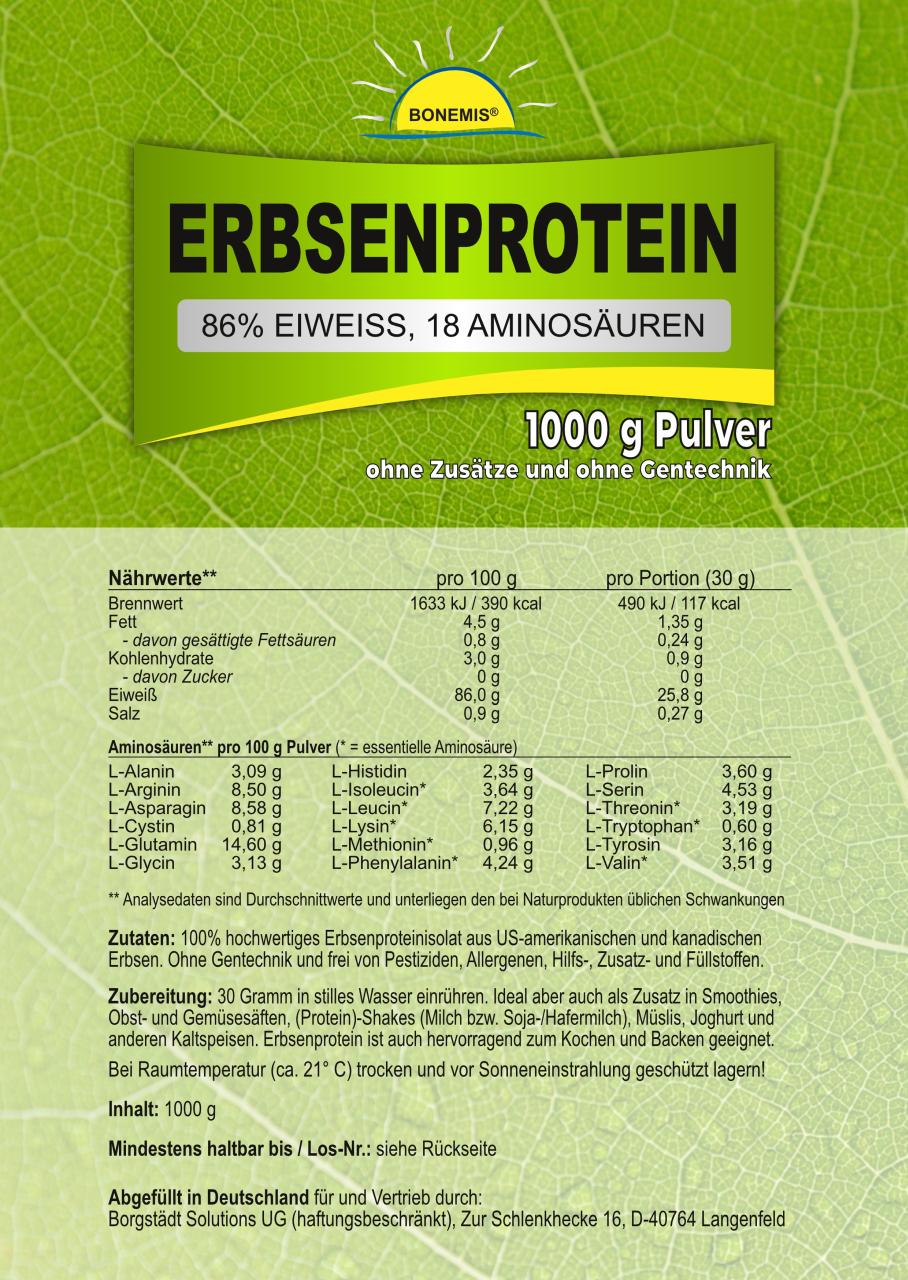 Bonemis® Erbsenprotein ist ein natürlicher, pflanzlicher Rohstoff mit wertvollen ernährungsphysiologischen Eigenschaften (eine ideale Proteinquelle für alle Vegetarier und Veganer). Es enthält nur 3% Kohlenhydrate, während das Aminosäureprofil sogar im Vergleich mit Molkenprotein (Whey Protein) überzeugen kann. Dabei ist es nicht nur ein vollwertiger Proteinlieferant sondern auch für Anwender geeignet, die gegenüber Laktose und Gluten empfindlich sind oder ganz einfach auf tierische Produkte verzichten möchten.