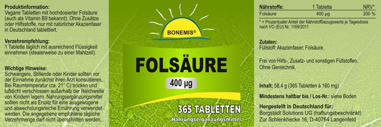 Vegane Tabletten mit hochdosierter Folsäure (auch als Vitamin B9 bekannt). Premiumqualität ohne unerwünschte Zusatzstoffe und ohne Gentechnik. Hergestellt in Deutschland. 365 vegane Tabletten im hochwertigen Braunglasbehälter mit Frischeversiegelung und zusätzlichem Siegeletikett für Ihre Sicherheit. Wir kontrollieren natürlich jedes Produkt vor Auslieferung. Sie können aber so auf Anhieb selber erkennen, ob sich die Ware auch nach dem Transport im unversehrten Originalzustand befindet. Die Tabletten sind sehr klein (ca. 6 mm, rund) und leicht zu schlucken.