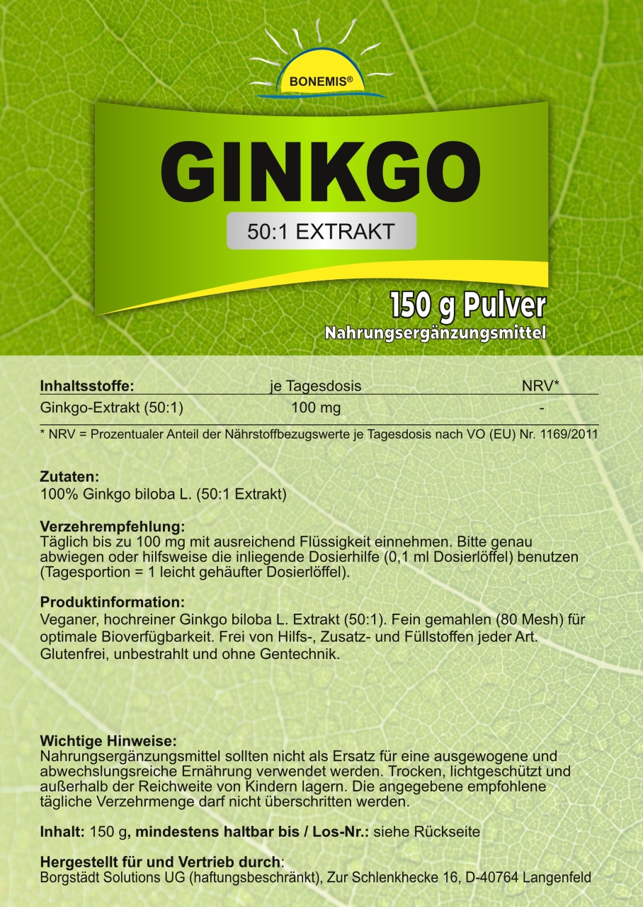 Veganer, hochreiner Ginkgo biloba L. Extrakt (50:1). Fein gemahlen (80 Mesh) für optimale Bioverfügbarkeit. Frei von Hilfs-, Zusatz- und Füllstoffen jeder Art. Glutenfrei, unbestrahlt und ohne Gentechnik. 150 g im Standbodenbeutel aus Kraftpapier (aluminiumfrei!) mit wiederverschließbarem Druckverschluss. Abgefüllt in Deutschland.
