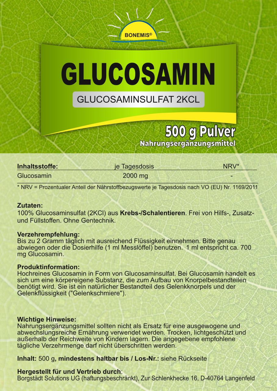 Hochreines Glucosamin in Form von Glucosaminsulfat. 500 g im Standbodenbeutel aus Kraftpapier (aluminiumfrei!) mit wiederverschließbarem Druckverschluss. Abgefüllt in Deutschland.