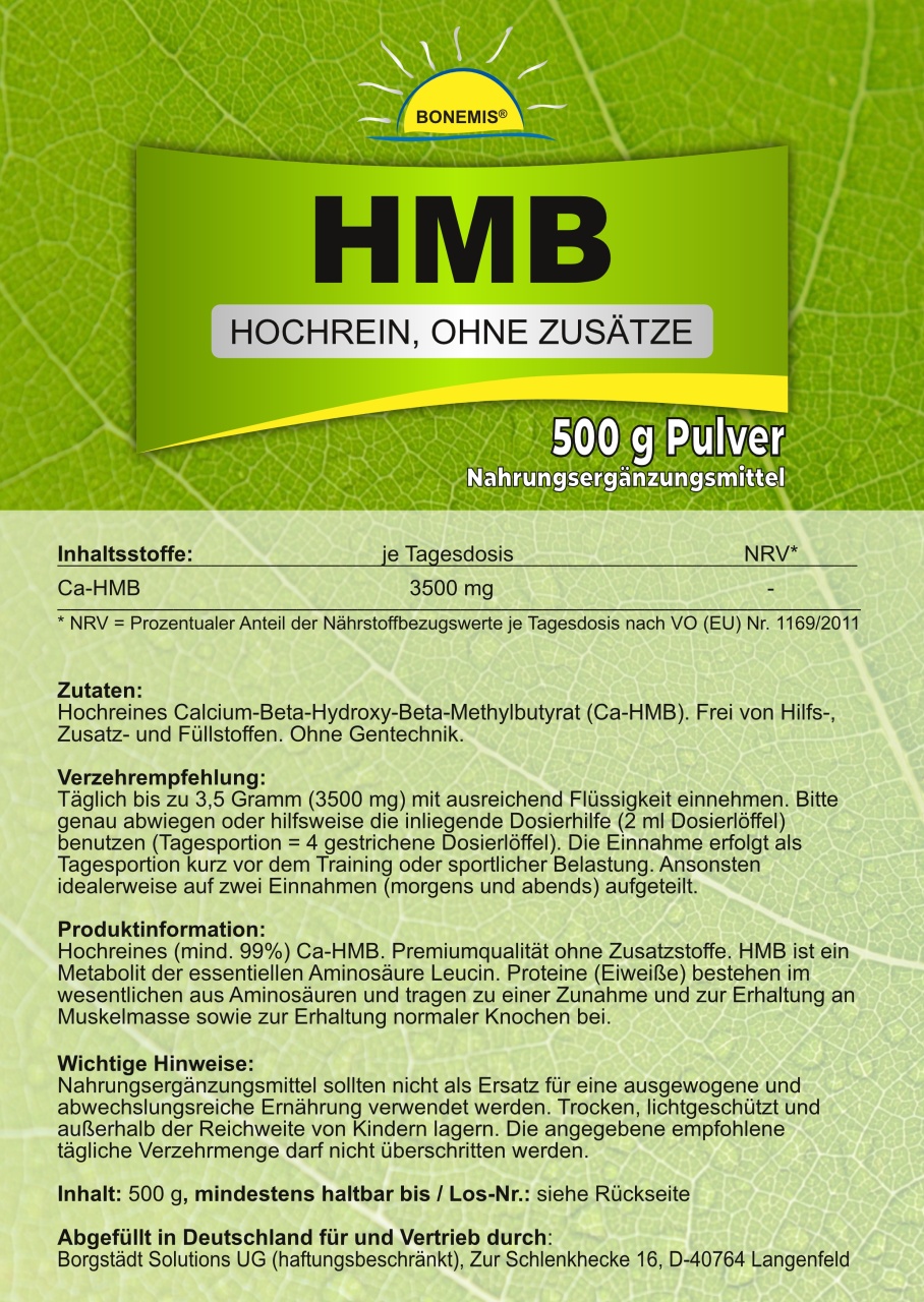 HMB ist ein Metabolit der essentiellen Aminosäure Leucin. Proteine (Eiweiße) bestehen im wesentlichen aus Aminosäuren und tragen zu einer Zunahme und zur Erhaltung an Muskelmasse sowie zur Erhaltung normaler Knochen bei.