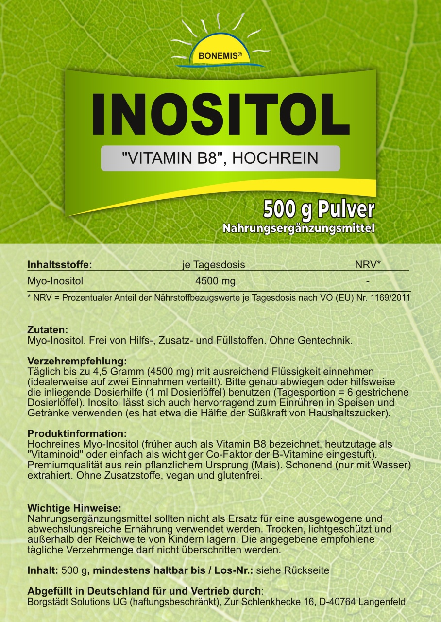 Bonemis® Inositol (""Vitamin B8""), hochreines Myo-Inositol, ohne Zusätze, 500 g im Beutel""
