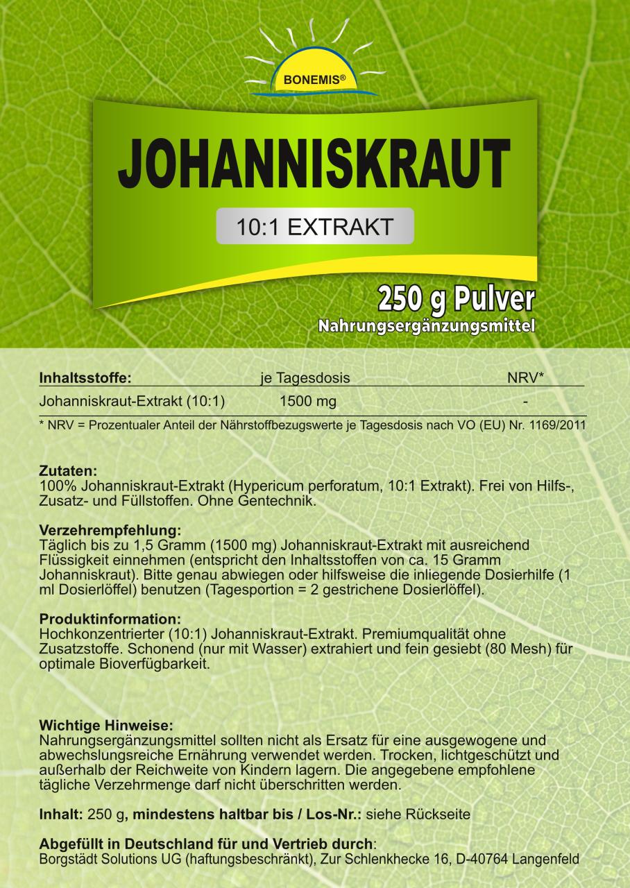 Bonemis® Johanniskraut (10:1 Extrakt), ohne Zusatzstoffe, 250 g Pulver im Beutel