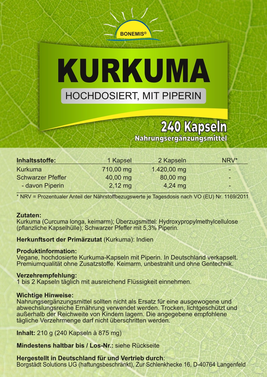 Bonemis® Kurkuma (hochdosiert, mit Schwarzem Pfeffer und Piperin), 240 Kapseln à 750 mg