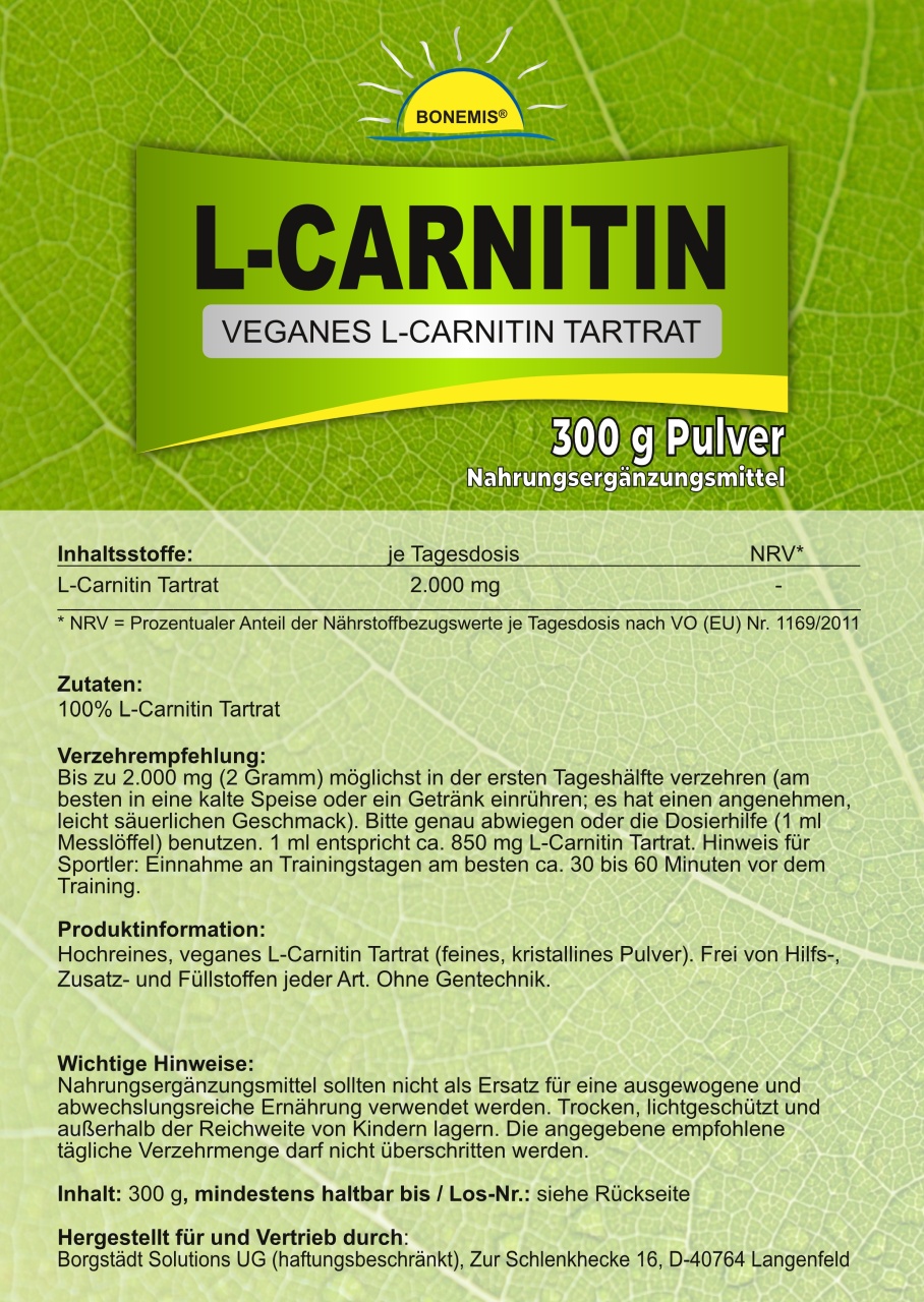 Hochreines, veganes L-Carnitin Tartrat (feines, kristallines Pulver). Frei von Hilfs-, Zusatz- und Füllstoffen jeder Art. Ohne Gentechnik. 300 g im Standbodenbeutel aus Kraftpapier (aluminiumfrei!) mit wiederverschließbarem Druckverschluss. Abgefüllt in Deutschland.