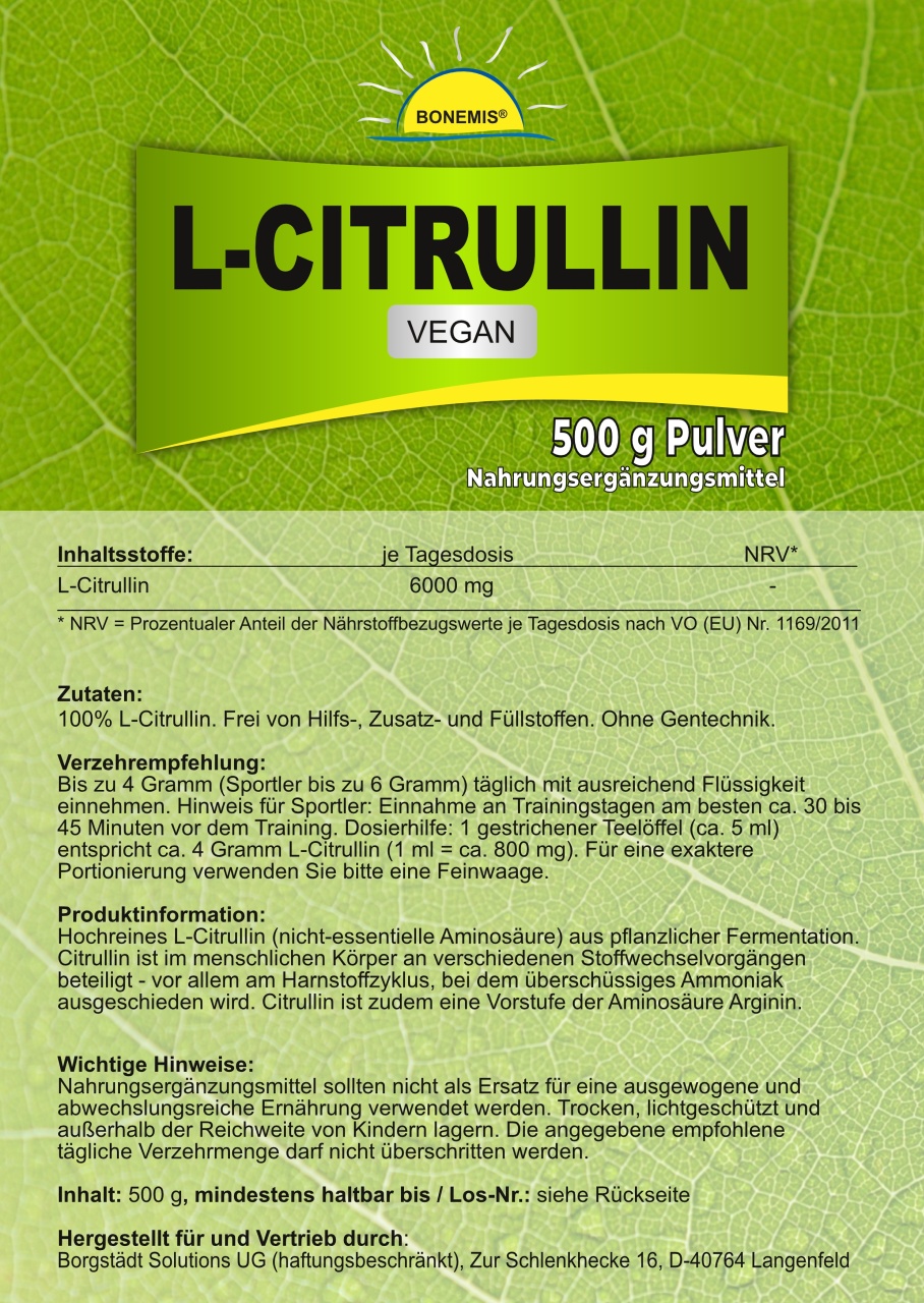Die Aminosäure L-Citrullin aus pflanzlicher Fermentation (vegan). 500 g im Standbodenbeutel aus Kraftpapier (aluminiumfrei!) mit wiederverschließbarem Druckverschluss. Abgefüllt in Deutschland.