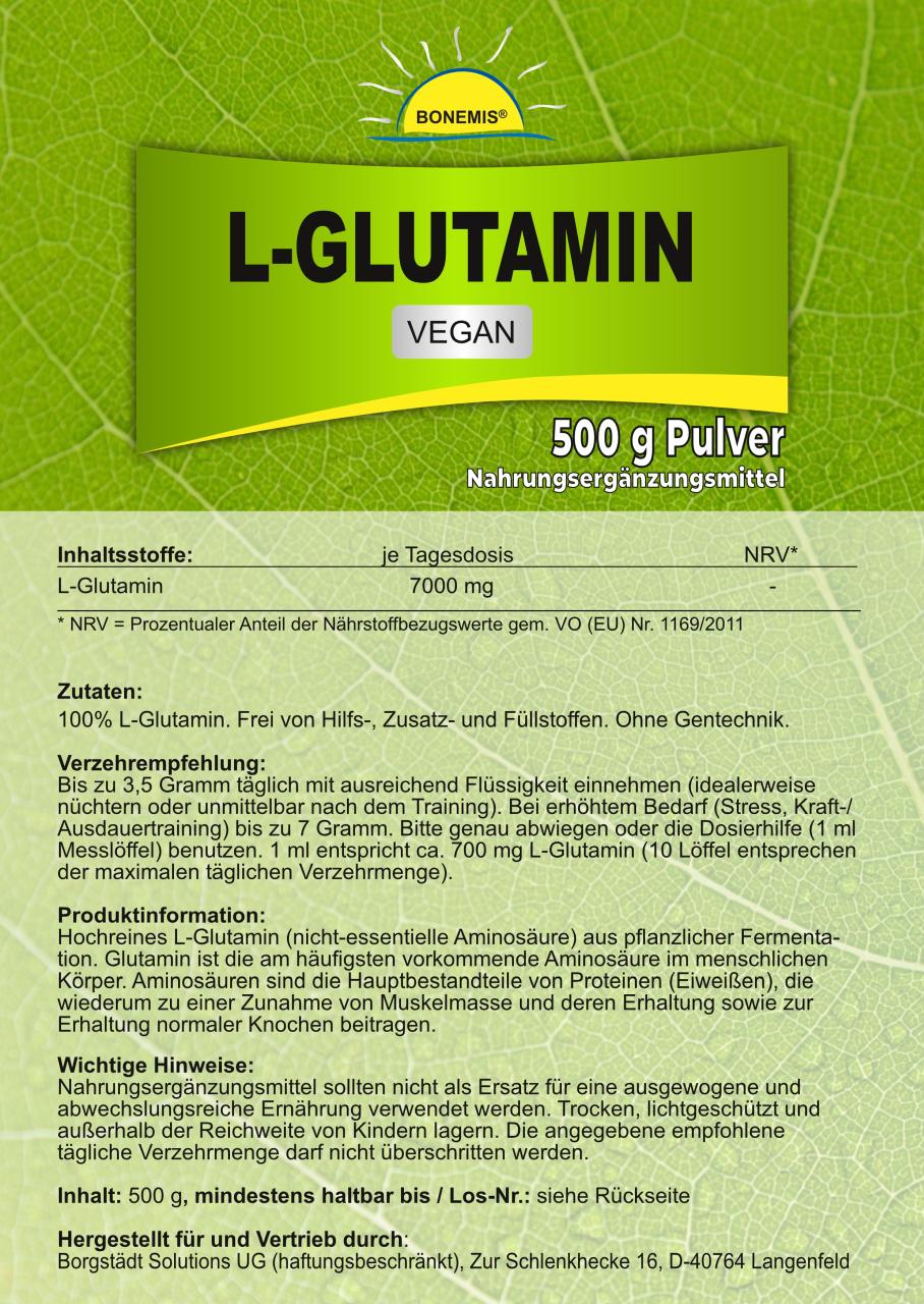 Bonemis® L-Glutamin, veganes Pulver, hochrein, ohne Zusatzstoffe, 500 g im Beutel