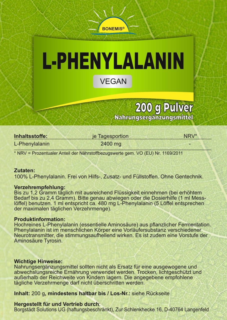 Die Aminosäure L-Phenylalanin aus pflanzlicher Fermentation (vegan). 200 g im Standbodenbeutel aus Kraftpapier (aluminiumfrei!) mit wiederverschließbarem Druckverschluss. Abgefüllt in Deutschland.