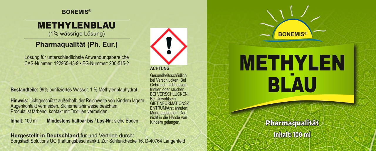Wichtiger Hinweis (Methylenblau gilt in Deutschland und der EU nicht als Lebensmittel!):