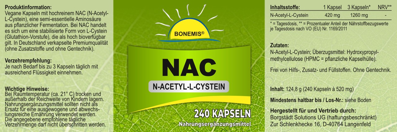 Kapseln mit hochreinem NAC (N-Acetyl-L-Cystein), einer semi-essentiellen Aminosäure aus pflanzlicher Fermentation. Bei NAC handelt es sich um eine stabilisierte Form von L-Cystein (Glutathion-Vorstufe), die als hoch bioverfügbar gilt. Vegane Premiumqualität, frei von Hilfs-, Zusatz- und Füllstoffen. Unbestrahlt und ohne Gentechnik. 240 Kapseln à 420 mg NAC im hochwertigen Braunglasbehälter mit Frischeversiegelung.