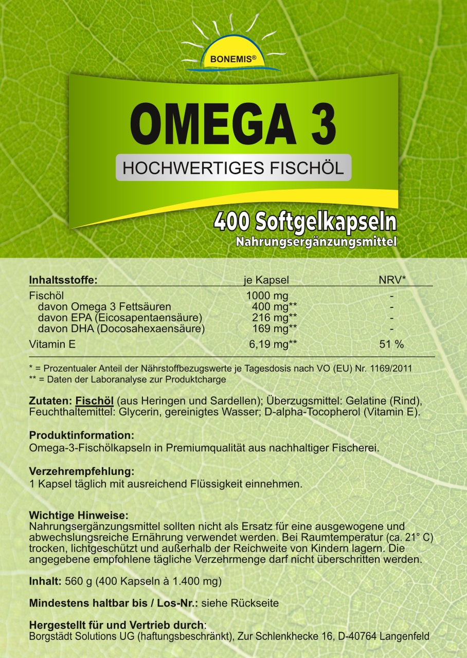 Aktuelle Analysewerte: je Kapsel 400 mg Omega 3 Fettsäuren (216 mg EPA, 169 mg DHA).