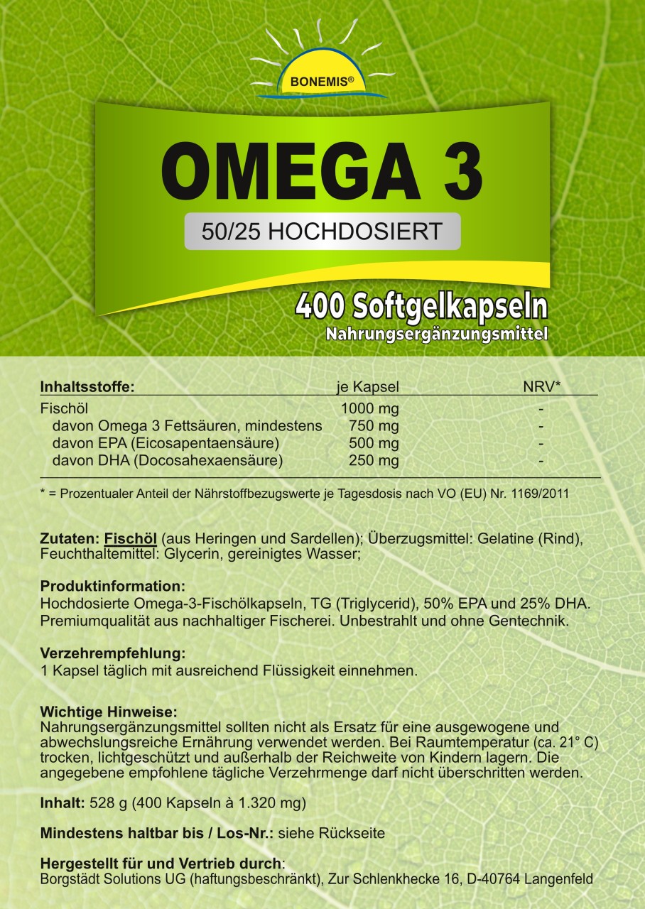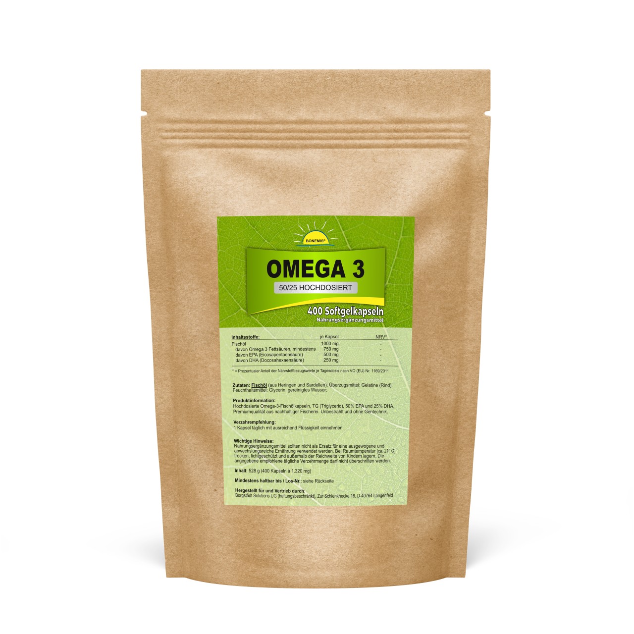 Bonemis® Omega 3, hochdosiert (50/25), 400 Kapseln à 1000 mg hochwertiges Fischöl im Beutel