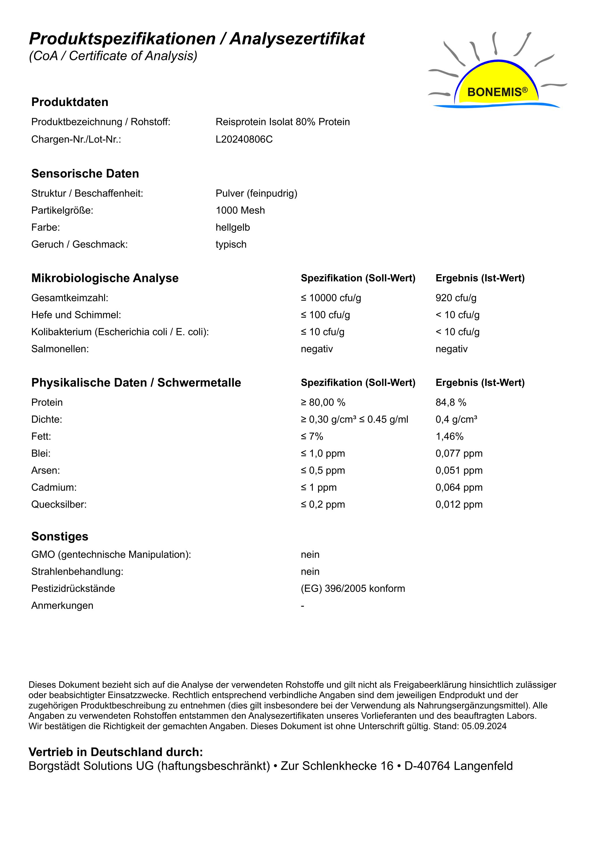 Tipp: Bonemis® Reisprotein hat einen hohen Eiweißgehalt von 84,7% und enthält 18 Aminosäuren, so zum Beispiel 36,3% essentielle Aminosäuren, 19,58% BCAA oder 8,31% Arginin! Wenn Sie unser Produkt mit anderen Produkten vergleichen, beachten Sie bitte, dass sich unsere Analysedaten der Aminosäuren auf 100 g Pulver beziehen. Manche Anbieter beziehen sich auf den reinen Eiweißgehalt und suggerieren dem unaufmerksamen Betrachter einen viel höheren Aminosäuregehalt als tatsächlich vorhanden.