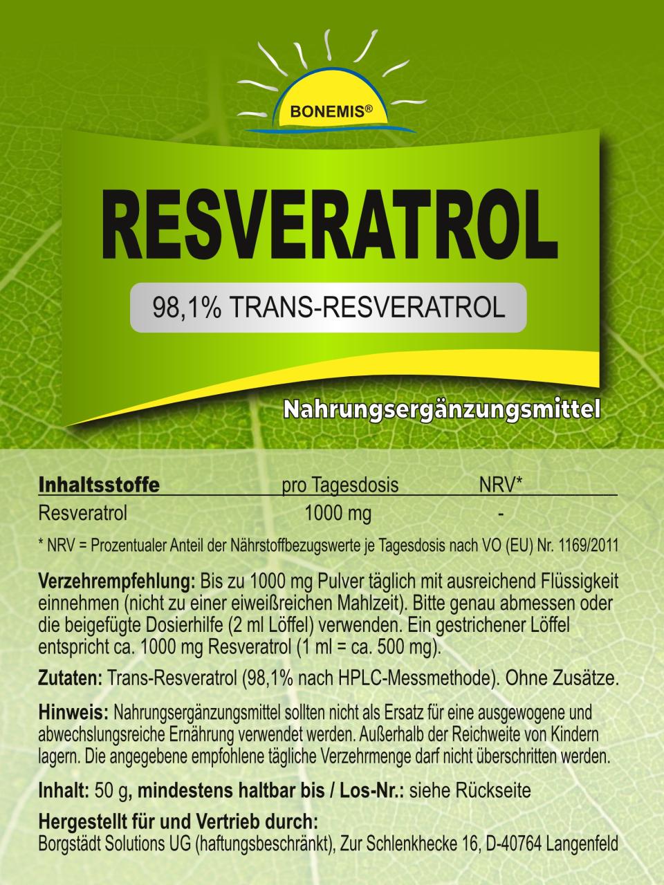 Bonemis® Resveratrol (98,1% Trans-Resveratrol nach HPLC), ohne Zusatzstoffe, 50 g Pulver im Beutel