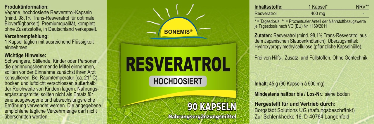 Vegane Kapseln mit hochdosiertem Resveratrol (mind. 98,1% Trans-Resveratrol für optimale Bioverfügbarkeit). Premiumqualität ohne Zusatzstoffe und ohne Gentechnik. Hergestellt und abgefüllt in Deutschland. 90 Kapseln à 400 mg Resveratrol im hochwertigen Braunglasbehälter mit Frischeversiegelung und zusätzlichem Siegeletikett für Ihre Sicherheit. Wir kontrollieren natürlich jedes Produkt vor Auslieferung. Sie können aber so auf Anhieb selber erkennen, ob sich die Ware auch nach dem Transport im unversehrten Originalzustand befindet.