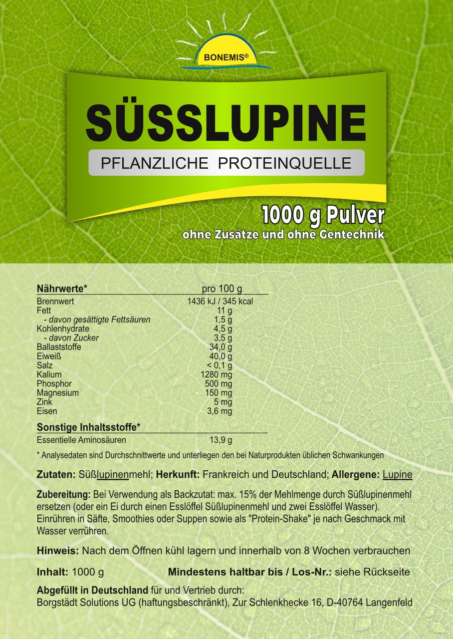 Bonemis® Süßlupine (Süßlupinenmehl), pflanzliche Proteinquelle, ohne Zusätze, 1 kg Beutel