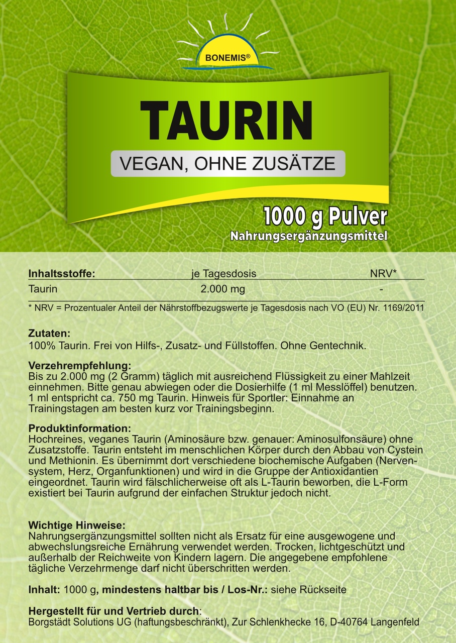 Hochreines, veganes Taurin (Aminosäure bzw. genauer: Aminosulfonsäure) ohne Zusatzstoffe. Wahlweise 500 oder 1000 Gramm im Standbodenbeutel aus Kraftpapier (aluminiumfrei!) mit wiederverschließbarem Druckverschluss. Abgefüllt in Deutschland.
