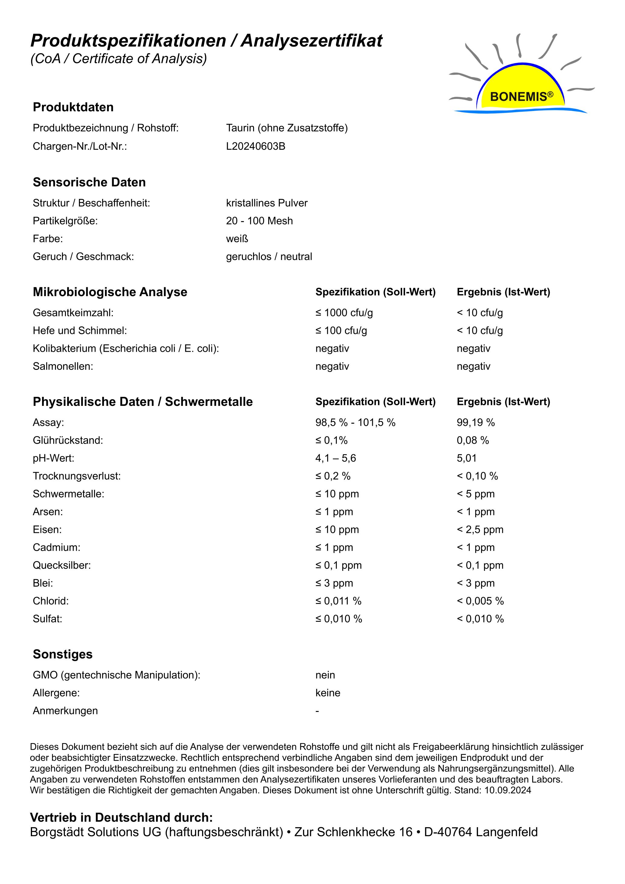 100% Taurin. Frei von Hilfs-, Zusatz- und Füllstoffen. Ohne Gentechnik.