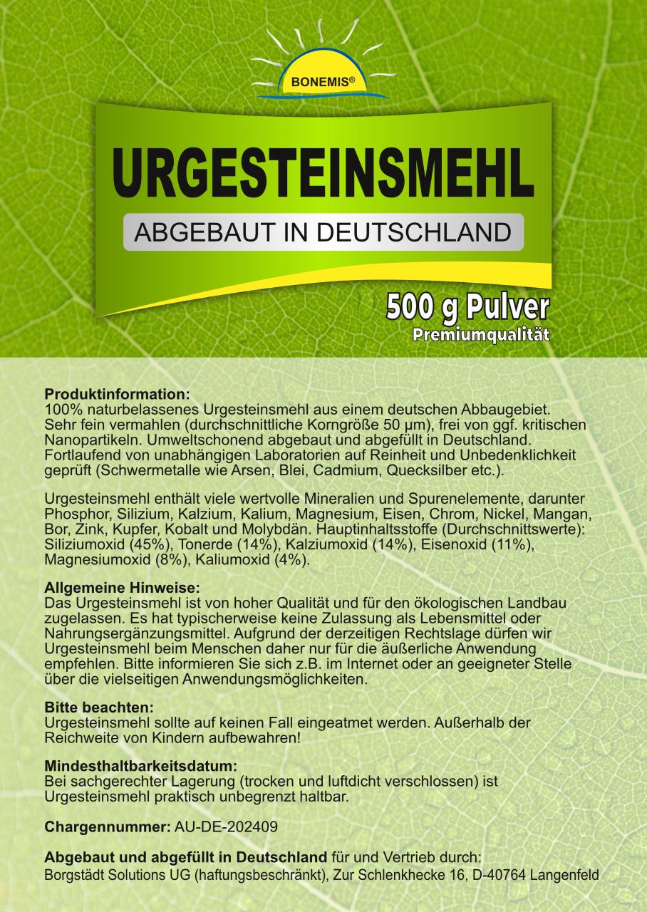 100% naturbelassenes Urgesteinsmehl aus einem deutschen Abbaugebiet. Sehr fein vermahlen (durchschnittliche Korngröße 50 µm), frei von ggf. kritischen Nanopartikeln. Umweltschonend abgebaut (Sauerland) und abgefüllt in Deutschland. 500 Gramm im Standbodenbeutel aus Kraftpapier (aluminiumfrei, wiederverschließbar).