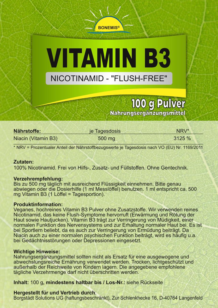Bonemis® Vitamin B3 (Nicotinamid, „flush-free“), Pulver, 100 g im Beutel