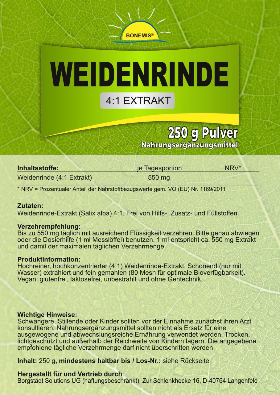 | Weidenrinde (4:1 Extrakt) | 550 mg | - |