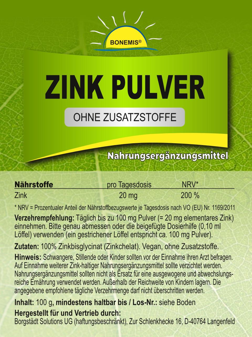 Bonemis® Zink Pulver, Premiumqualität ohne Zusatzstoffe, 100 g im Beutel, vegan