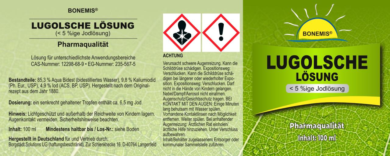 Bitte beachten Sie, dass es sich bei Lugolscher Lösung nach derzeitiger Rechtsprechung nicht um ein Arzneimittel, Lebensmittel oder Nahrungsergänzungsmittel handelt. Achtsamer Umgang ist erforderlich (bitte informieren Sie sich z.B. im Internet oder an geeigneter Stelle über die vielseitigen Anwendungsmöglichkeiten).