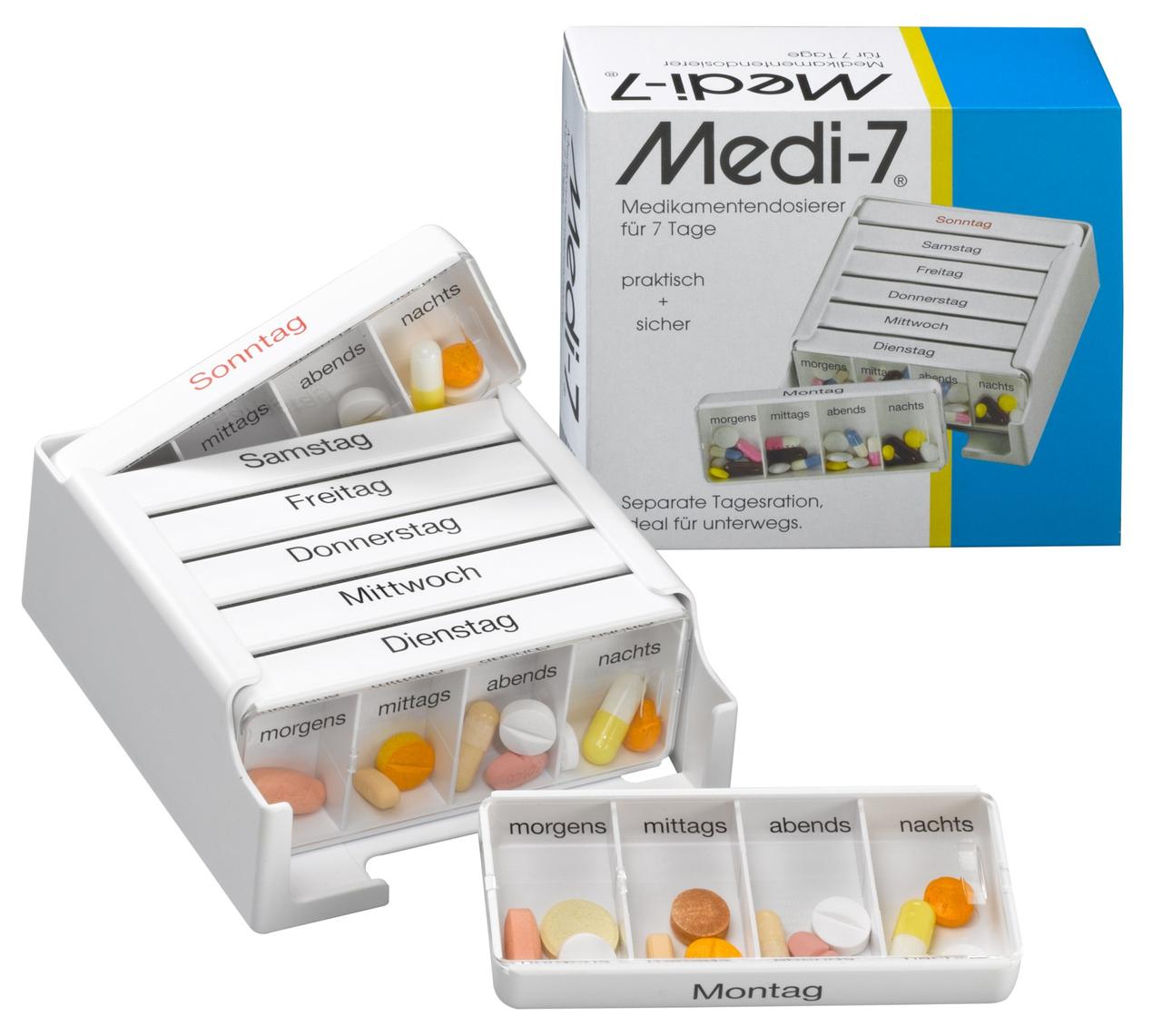 Medikamentendosierer für 7 Tage, hergestellt aus hochwertigem ABS-Kunststoff mit Klarsicht-Schiebedeckel. Jahrzehntelang bewährt im ambulanten und stationären Einsatz.