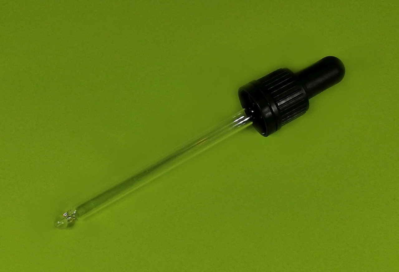 Garantieverschluss inkl. Klarglas-Tropfpipette mit gebogener Kugelspitze. 18 mm Gewinde (DIN 18). Passend für unsere 100 ml Blau-/Braunglasflaschen.