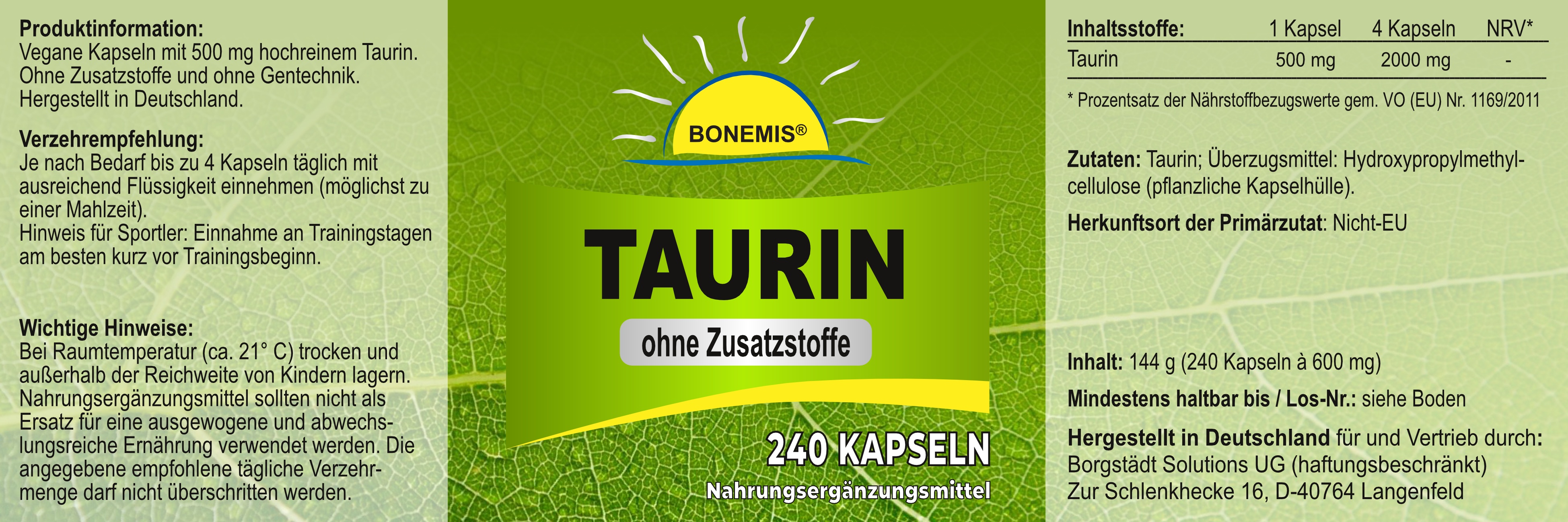 Zutaten: Taurin; Überzugsmittel: Hydroxypropylmethylcellulose (pflanzliche Kapselhülle).